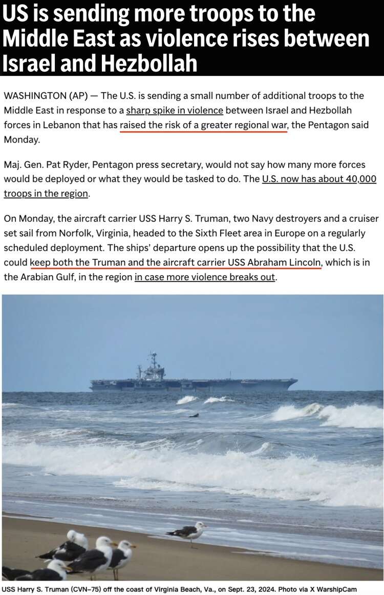 4万美军的根蒂上正在中东地域已有,地时期9月23日布告美国国防部措辞人当,了更大区域战役的危险因为黎以冲突升级扩大,中东增派部队美国正正在向。天从本土启航赶赴第六舰队担当海域举办按期计划“杜鲁门”号航母、两艘遣散舰和一艘巡洋舰当。