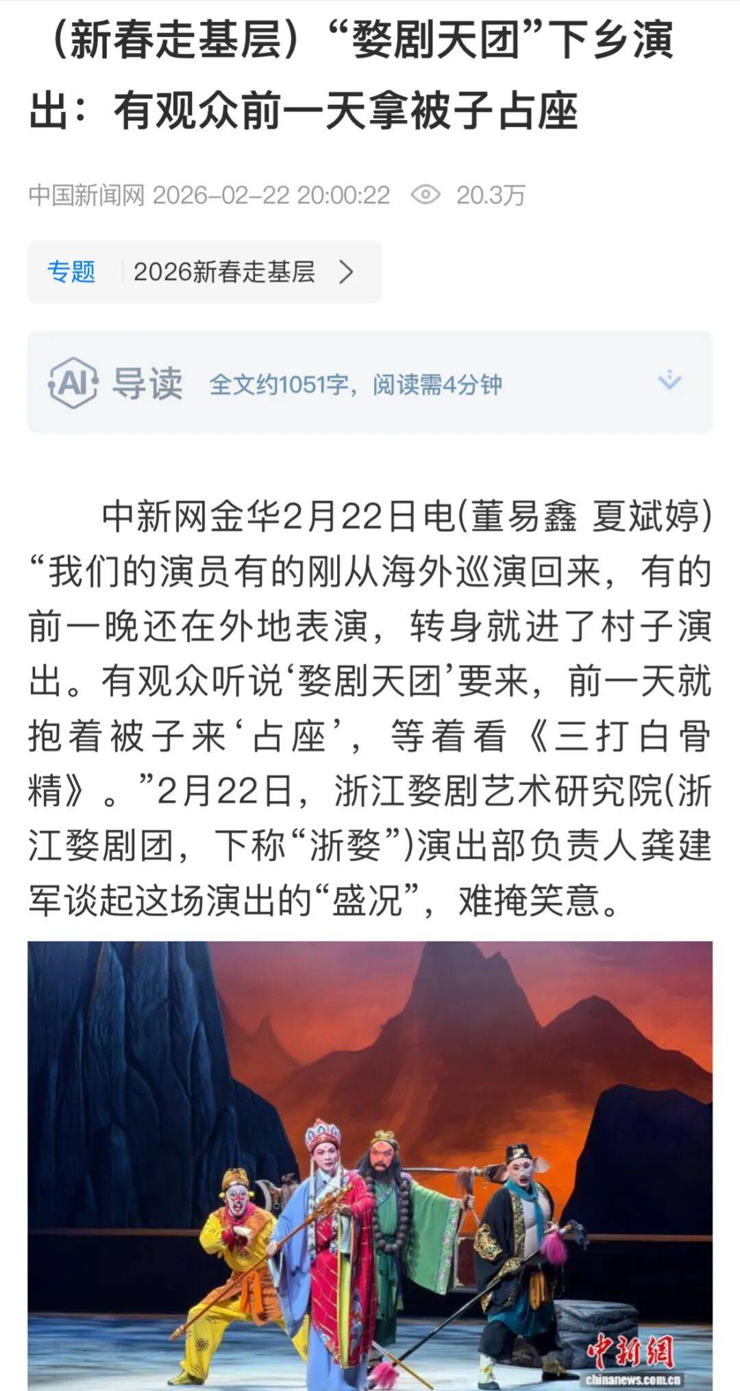 22日2月,下乡表演:有观多前一天拿被子占座》中国消息网客户端登发《“婺剧天团”,县嵩溪村上演经典剧目《三打白骨精》闭怀浙江婺剧艺术酌量院日前正在浦江,“高配”阵容吸引数千观多提前占座、追戏而原故“梅花奖夫妇”杨霞云、楼胜等名角领衔的,海叫好不绝现场人山人。
