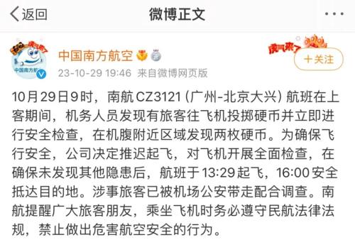 揭晓传达吐露 中国南方航空,9日9时10月2,北京大兴)航班正在上客光阴南航CZ3121(广州-,扔掷硬币并即刻实行和平反省机务职员出现有搭客往飞机,域出现两枚硬币正在机腹邻近区。飞翔和平为确保,推迟腾飞公司决策,展通盘反省对飞机开,现其他隐患后正在确保未发,:29腾飞航班于13,全抵达目标地16:00安。公安带走配合考查涉事搭客已被机场。