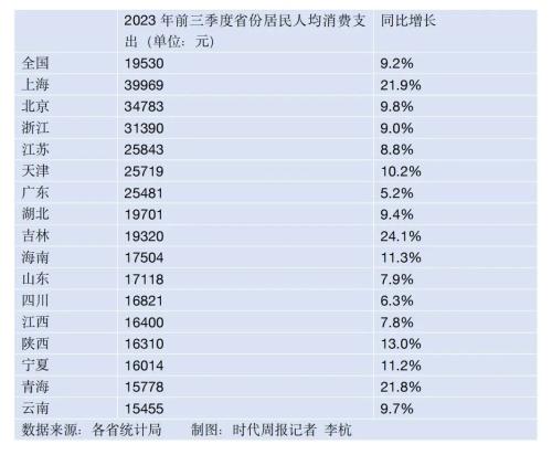 月29日截至10,季度住户人均消费支付数据已有16个省份告示了前三,费支付高出天下均匀程度7个省份前三季度人均消。中其,能“买买买”上海住户最,9969元人均花费3,江紧随其后北京、浙。速上看从增,西部省份增速最高宁夏、青海等中。