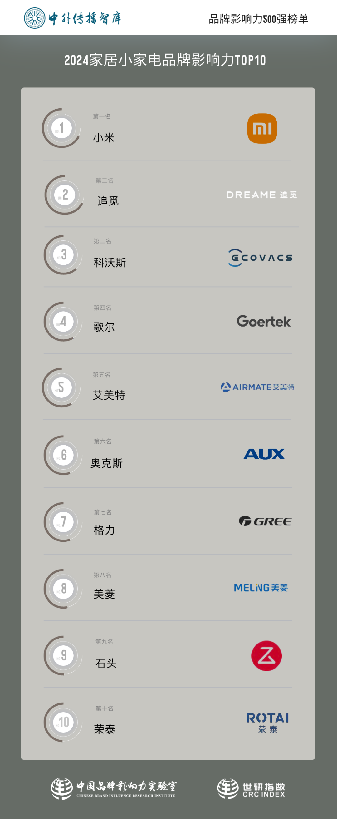 影响力评判系统基于世研指数,三个维度举行归纳评判的结果从竞赛力、品牌力和传扬力,影响力TOP10排序如下2024家居幼家电品牌: