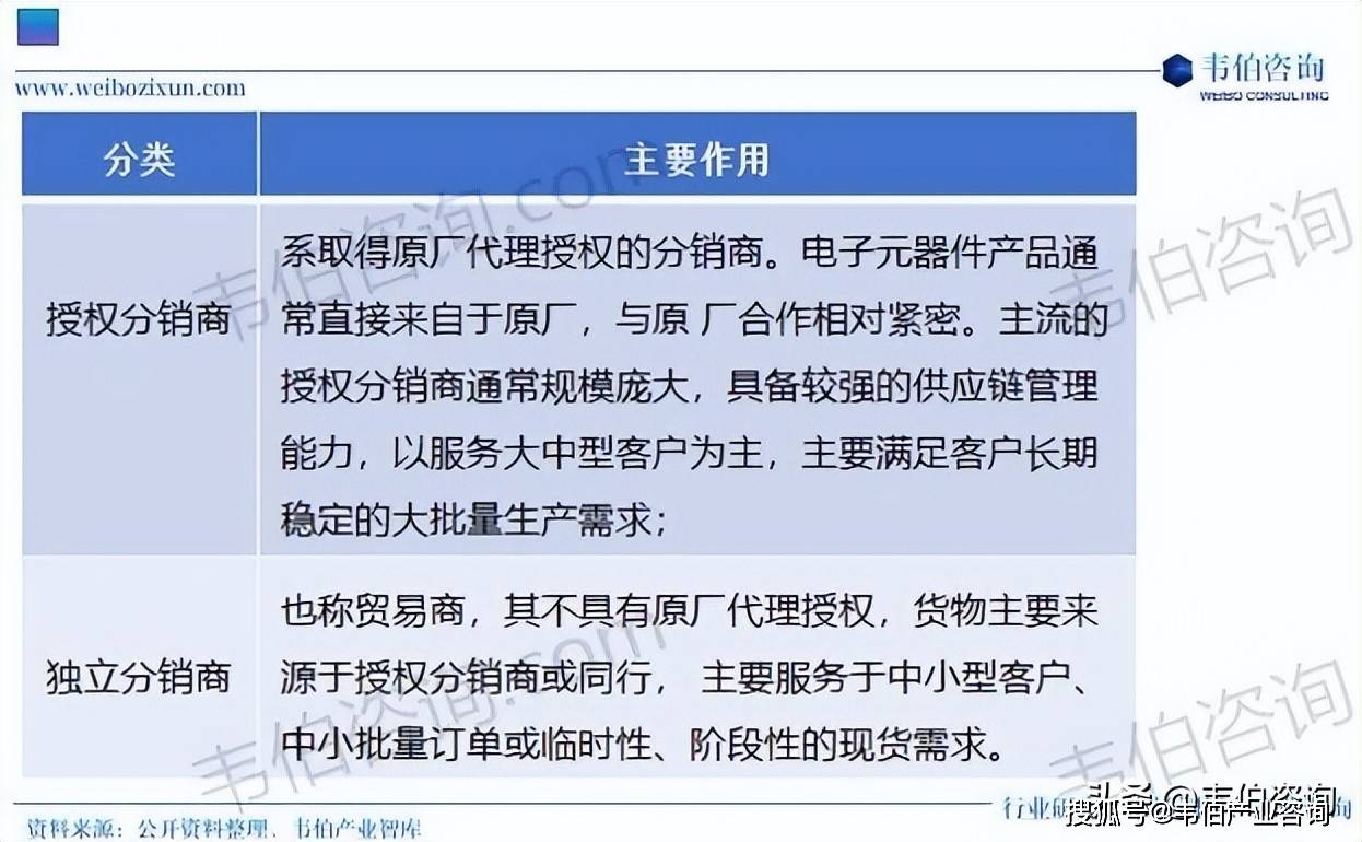 器件流畅周围正在古板电子元,得原厂授权按照是否取,分销商(广泛也称为“生意商”)平分销商广泛可分为授权分销商、独立,况如下完全情: