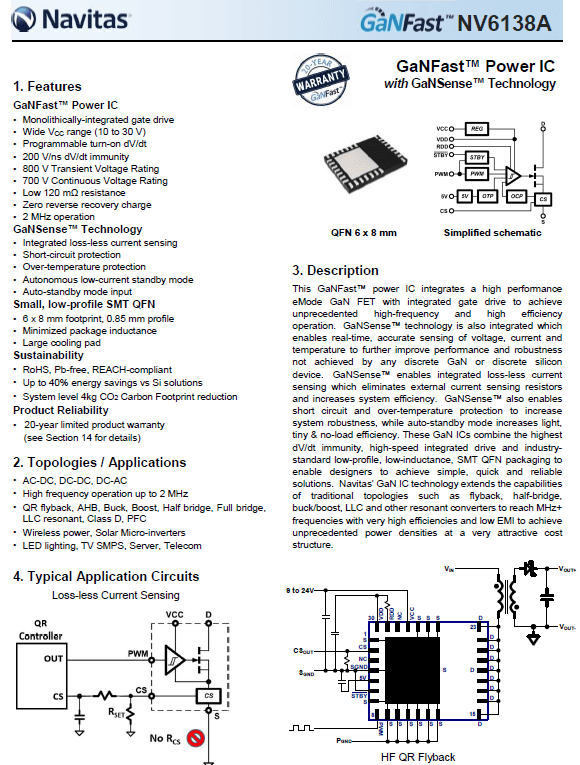 芯片NV6138A纳微的氮化镓功率,的氮化镓功率芯片是一颗高集成度,度无损耗电流采样电道内部集成驱动器和高精,流取样电阻无需表置电,电阻的损耗肃清取样。